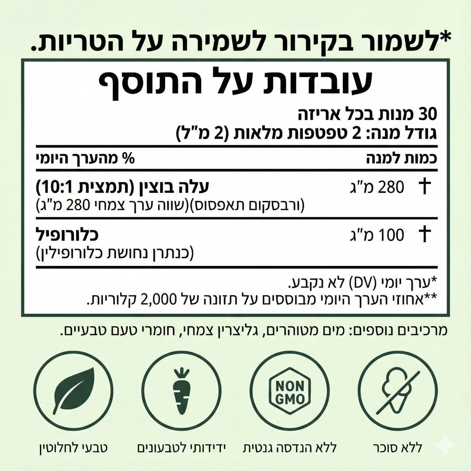 משלבת שני רכיבים עוצמתיים מיצוי עלי מוליין וכלורופיל שנחקרו במשך מאות שנים ומגובים במחקרים מודרניים.
